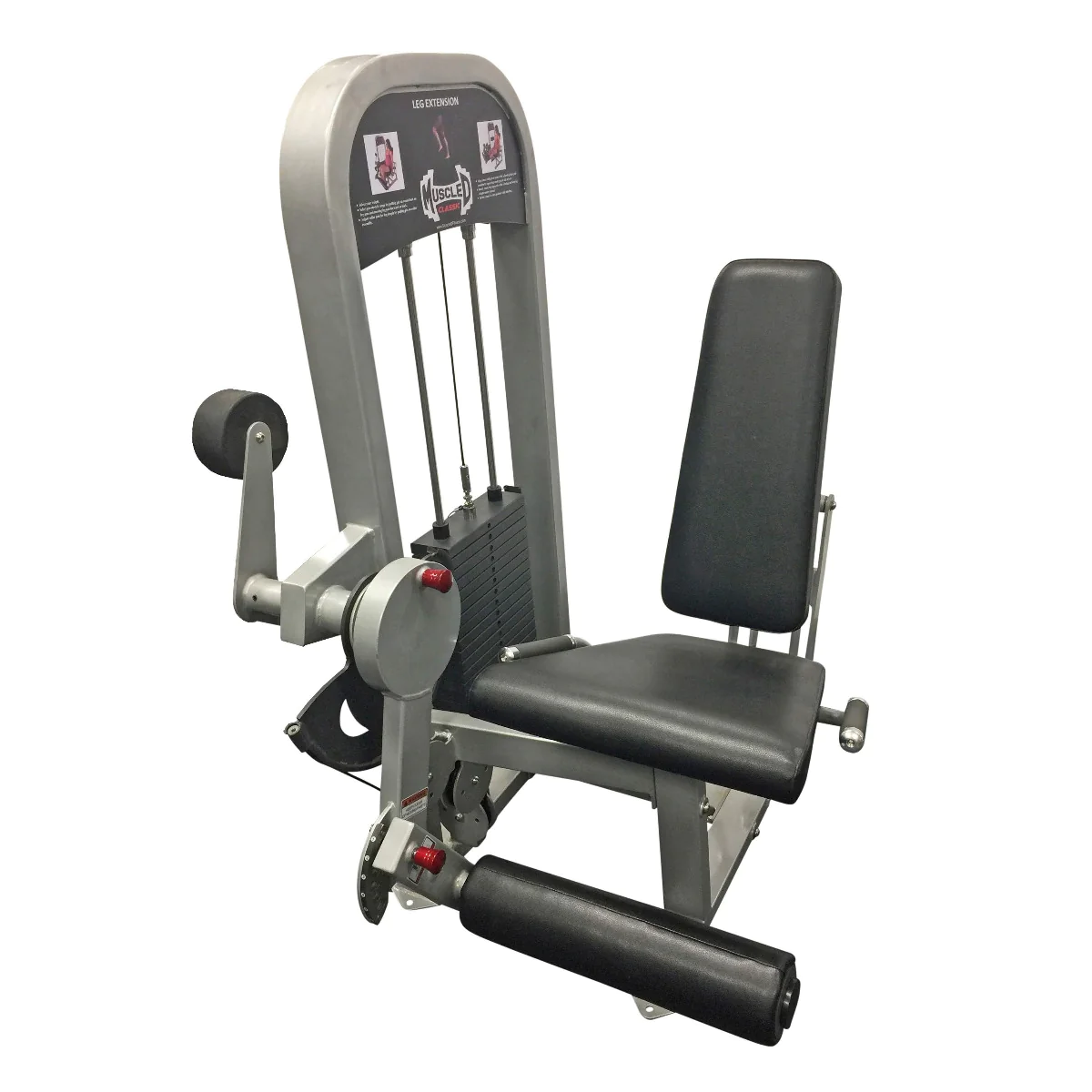 Leg Extension Machine – Muscle D Fitness (MDC-1005) – The Muscle D Seated Leg Extension Machine is designed to isolate the thigh muscles during resistance training for maximizing size and strength gains. For added effectiveness the trainee can position the angle of the feet while using the MDC-1005 to focus on different regions of the quads, such as inner, outer and mid. Pop-pin adjustments can be made to customize the range of the extension as well as the proximity of the foot roller to accommodate the size and training preferences of the user. A squeeze handle quickly adjusts the backrest for the perfect custom fit. A conveniently located 200 lb. weight stack allows the trainee to increase or reduce resistance without having to exit the machine. The weight stack resistance system incorporates aircraft quality cables, pulley wheels with sealed bearings and polished steel guide rods. And the heavy-duty steel frame provides a rock solid cockpit for blasting the quad muscles.