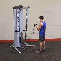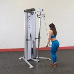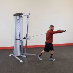 Body-Solid ProClub Line Series II Single Cable Column The Pro ClubLine Series II S2CC from Body-Solid is a single cable column functional trainer machine with adjustable high to low pulley and selectorized weight stack for unilateral resistance training. The weight stack is available in three sizes (160, 210 and 310 lbs), each offering 1/2:1 resistance which allows manageable incremental weight changes for smaller muscle groups targeted during isolation exercises and unilateral strength training. The S2CC offers a virtually unlimited range of exercise possibilities. 36 different pulley starting positions allow users to perform any number of high-pulley, mid-pulley or low-pulley exercises including rows, crunches, wood chops, biceps curls and more. The adjustable pulley swivels 180 degrees, increasing both the range of motion and variety of exercise options. The S2CC Single Cable Column includes a nylon cable handle with three length adjustments, a straight bar with swivel attachment for low rows, curls, and triceps press downs, and an ankle cuff for performing leg exercises for the inner and outer thighs, glutes, and quadriceps. Attach any number of optional handles and cable accessories to this universal machine and open up a whole new world of movements for sports performance training and injury rehabilitation. The S2CCs compact footprint and simple adjustments make it an ideal fit in any home workout space, training studio, or commercial gym setting.