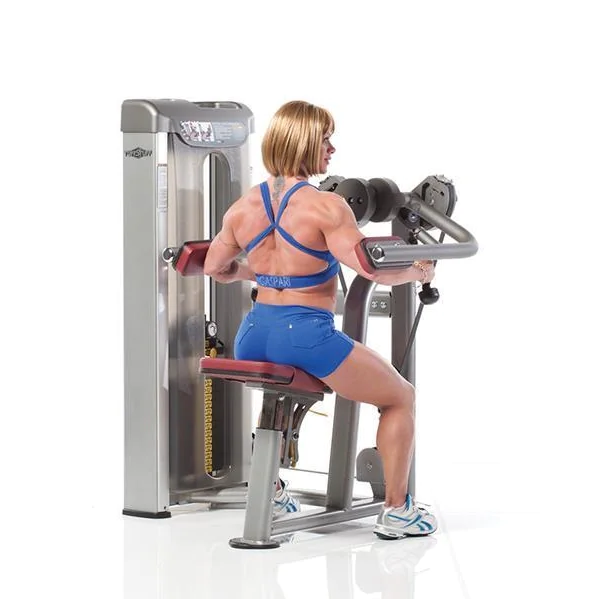 The Proformance Plus Lateral Raise ensures isolation of the lateral head of the deltoid. The seat not only adjusts for users of different heights with a gas-assisted adjustment, but it is also angled forward slightly so that the trainee is in a sound biomechanical position for lifting without having to resort to swinging to generate momentum. In addition, the Counter-balanced pivot arms provide smooth motion and low starting weight, and custom rope handles allow free hand movement and further ensure correct exercise application.