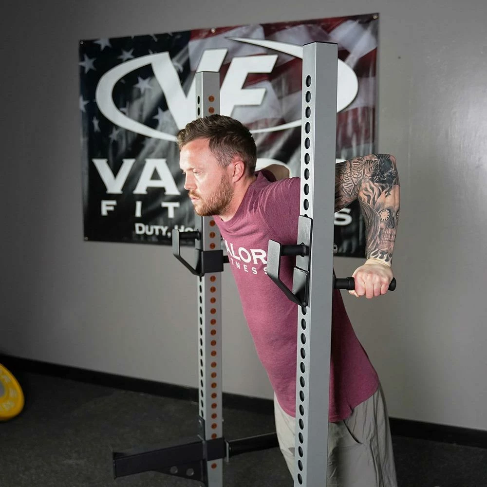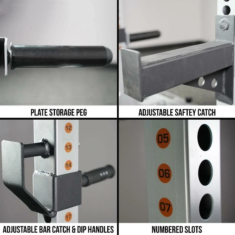 - DIP HANDLES: Adjustable dip handles to add versatility. Opposite side of the dip handles serves as the BAR HOLDERS when racking barbell.