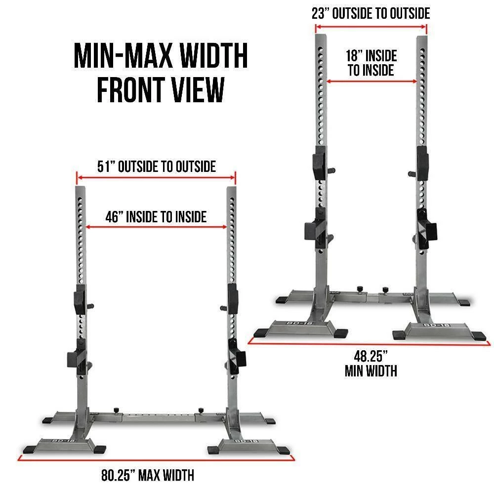 [additional]The uprights of each tower are static and do not telescope to ensure maximum strength in the frame and add safety which is a key feature of the BD-18. 2 adjustable safety catches are included to provide safety in the event the user is unable to complete the lift. Adjustable bar holders attach to each upright for racking and unracking barbells, while also serving as dip handles on the opposite to add versatility to workouts. With a recommended maximum weight load of 600 lb, the BD-18 Squat Stand Towers include 2 Olympic Spring Collars (2”) and 2 Olympic Sleeve Adapters that convert 1” plate storage pegs to 2”.
