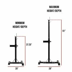 - ADJUSTABLE: Uprights adjust between 10 different heights from 37.25” to 61” tall. Also included are adjustable safety catches from 19.75” from the floor to 31.75” tall with 7 adjustment positions. Base frame adjusts from 20” wide to 28” wide.