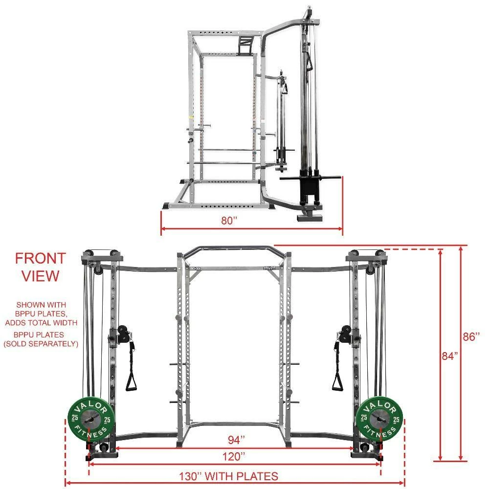The Valor Fitness BD-33BCC Power Rack with cable crossover includes all the features of the BD-33 Power Rack with the added BD-CC2.0 Cable Crossover Attachment.
