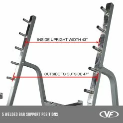 - BAR HOLDERS: 5 solid steel bar positions measuring 1” in diameter and 4” in length for racking the barbell during squats and bench press. Positions are 7.5” apart.