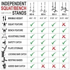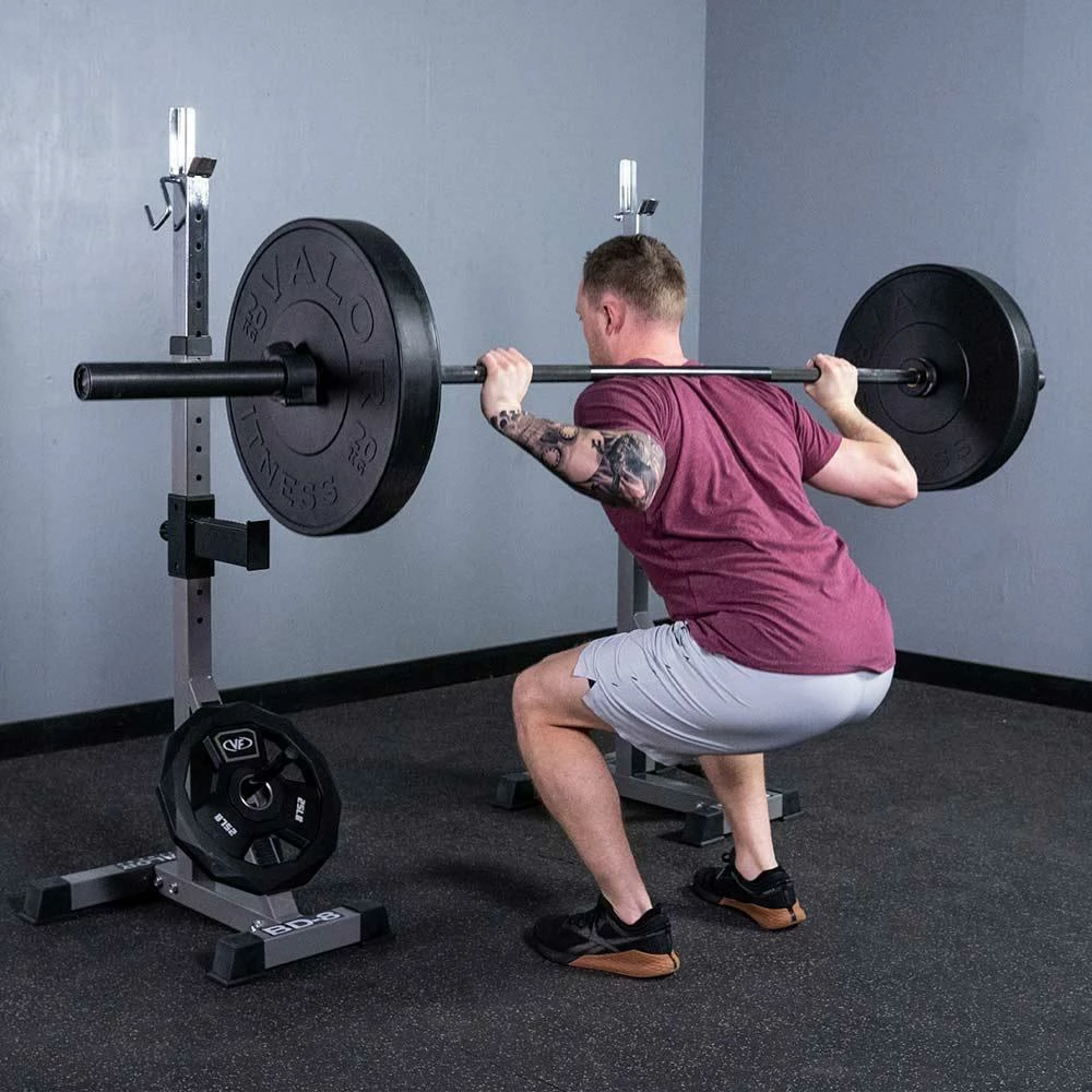 The Valor Fitness BD-8 Independent Squat Stand Towers are a set of adjustable upright stand designed primarily for squat movement but with the ability to accommodate a bench for bench press functions. Constructed of 2” x 2”, 13-gauge steel, this unit has adjustable uprights with 10 different positions ranging from 41.5” to 67” to make this a great product for multiple users.