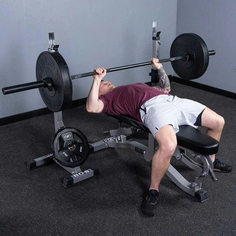 J-Hooks are located at the top of the uprights to safely rack the bar during squats. The safety catches adjust from 22” to 36” from the floor. To adjust the position of the safety catches, simply loosen the popper pins, pull, and then slide into the preferred position. Retighten the popper pin to secure it into position. The base of each stand is also adjustable and expandable, with 3 different positions ranging from 20” to 28”. With an expanded foot base, the unit becomes even more stable, if required. Each stand also features a 1” storage peg, 7” in length, to safely store standard and Olympic plates for a clean and organized gym. These pegs are also compatible with the Valor Fitness EX-10 Olympic Adapter Sleeve that converts 1” storage pegs to 2” storage pegs. When loaded with plates, the storage pegs enhance the stability of each stand. To perform bench presses, create enough distance between each stand to allow enough room for an individual bench to easily slide in. Be sure to adjust the J-hooks and uprights to a height the is close enough to the bench to easily rack and unrack a barbell. With a maximum weight load of 350 lb directed downward, the BD-8 Independent Squat Stand Towers is an ideal addition to any home or light-commercial gym.