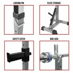 - SAFETY CATCH:Provides safety to the user in squat and bench press function in the event the lift cannot be completed. J-Hooks ensure the bar has a safe resting place when not in use.