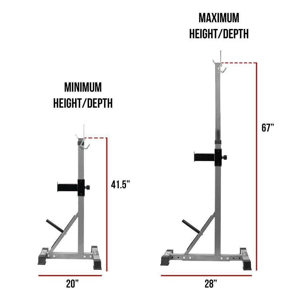 - ADJUSTABLE: Uprights adjust between 10 different heights from 41.5” to 67”. Safety catches adjust between 7 heights from 22” to 36”. Adjustable base ranges from 20” to 28” to become a more stable base.