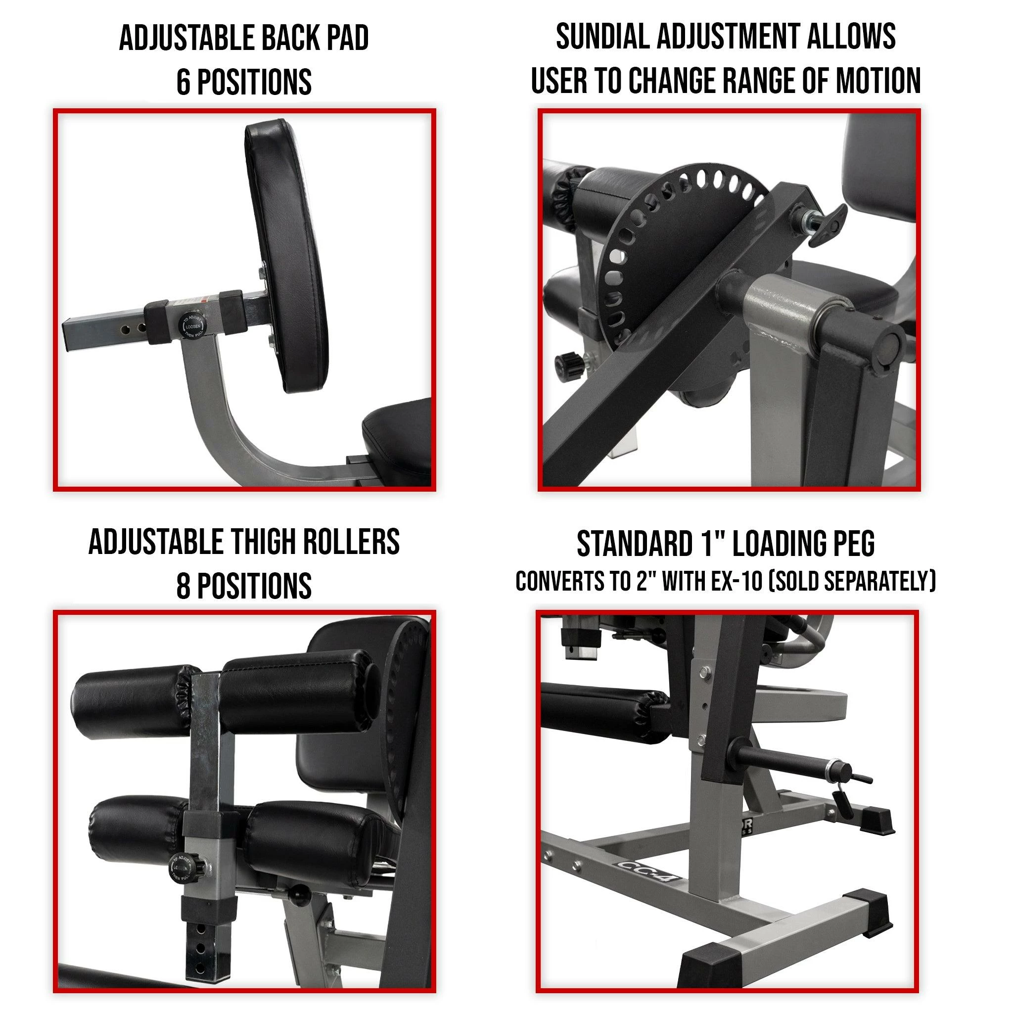 - ADDITIONAL: This leg curl leg extension machine is compatible with any plate. It is compatible with standard 1″ weight plates and 2″ Olympic weight plates. The EX-10 Olympic Adapter Sleeve that converts 1″ standard weight plate posts to 2″ Olympic weight plate posts is sold separately. Arrives in 2 separate boxes.
