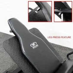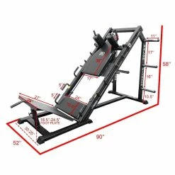 - ADDITIONAL: Adjustable footplate with 4 positions to get the most comfortable and effective position for your workout, whether it be in the hack squat or leg press function. Footprint measures 90″ x 52″ x 58″. Carriage system has a max weight load of 660 lb, with 6 storage pegs at the rear that can hold up to 270 lb each. Weight of plate carriage without any plates is 85lbs. Durable vinyl back and shoulder pads for comfortable positioning while in use. Arrives in 7 separate boxes.