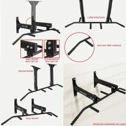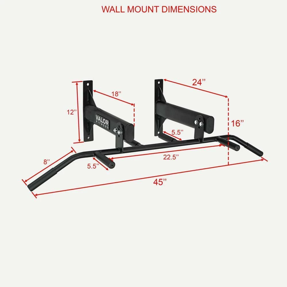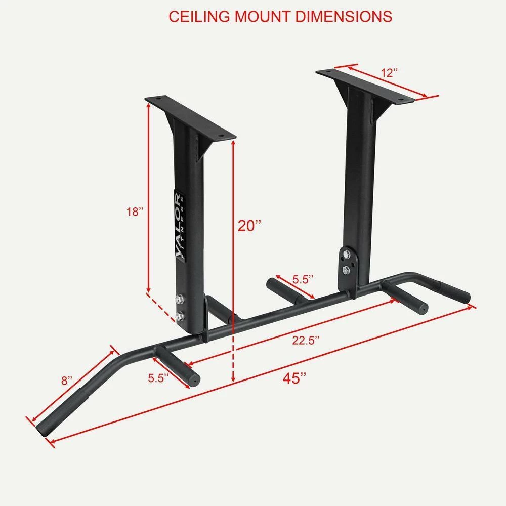 - ADDITIONAL: Measures 22.5” (L) x 45” (W) x 15” (H) in wall mount position (extends 22.5” from wall), and 12.5” (L) x 45” (W) x 25” (H) in ceiling mounted position (hanging 25” from ceiling). 5.5” long grip handles. Commercial grade pullup bar. Mounting hardware included.