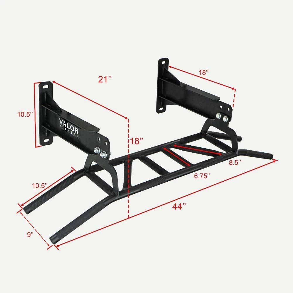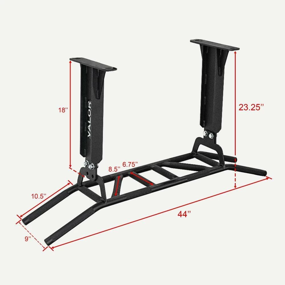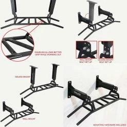 - ADDITIONAL: Measures 21” (L) x 44” (W) x 18” (H) in wall mount position (extends 21” from wall), and 10.5” (L) x 44” (W) x 23.25” (H) in ceiling mounted position (hanging 23.25″ from ceiling). Commercial grade pullup bar. Mounting hardware included.