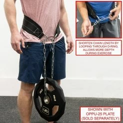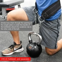 Simply loop the heavy-duty chain through the mouth opening of the weight plate or under the handle of the kettlebell and attach the carabiner clip to the other side of the belt. Users can shorten the length of the chain to meet their needs by looping it through the D-ring on the opposite before adding weight β this allows more depth for certain exercises and users.