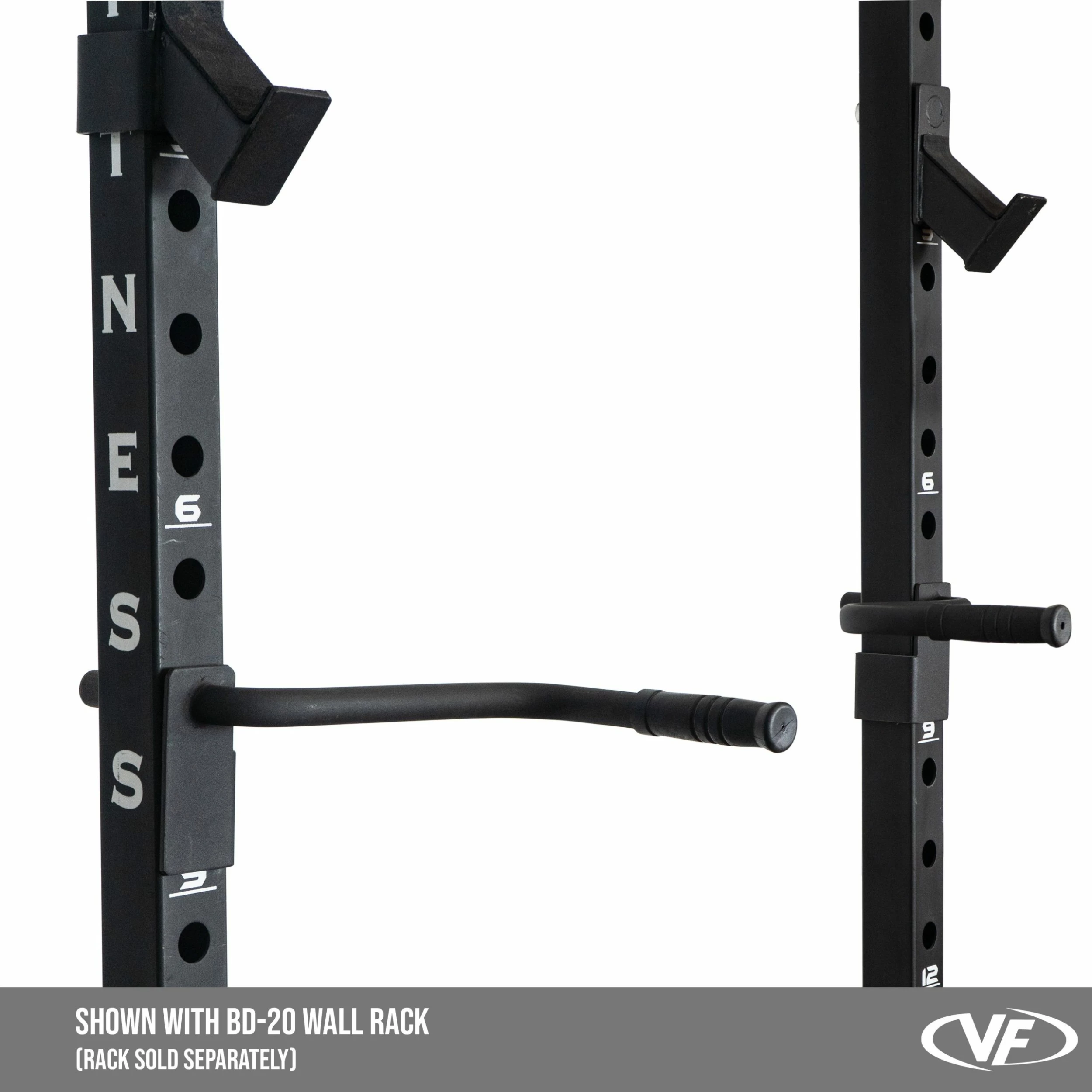 - SECURE: Steel rod dip handles are welded to a 3-sided face plate for a secure grip on the 2.5″ x 2.5″ frames on the Valor Fitness BD-11, BD-20, and BD-41 Power Racks.