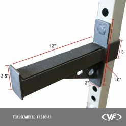 MB-H bar extensions are 2.5″ x 2.5″ and will fit the Valor Fitness BD-11, BD-20 and BD-41 Power Racks. The Valor Fitness MB-F Safety Catches are 2″ x 2″ and will only fit Valor Fitness BD-7 and BD-33 Power Racks. Please note that all Valor Fitness accessories are designed to fit Valor Fitness products only. Max weight limit is 750 lb – sold in pairs.