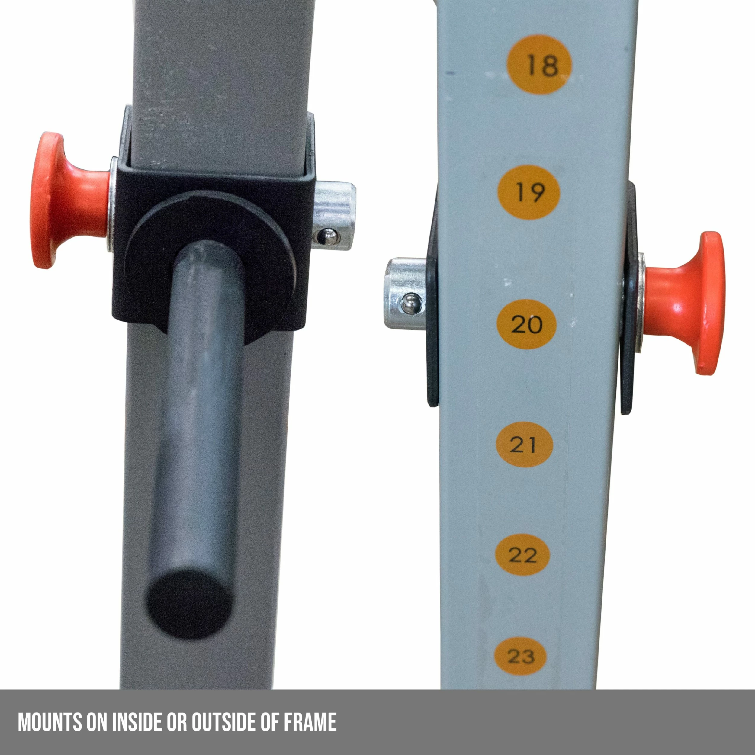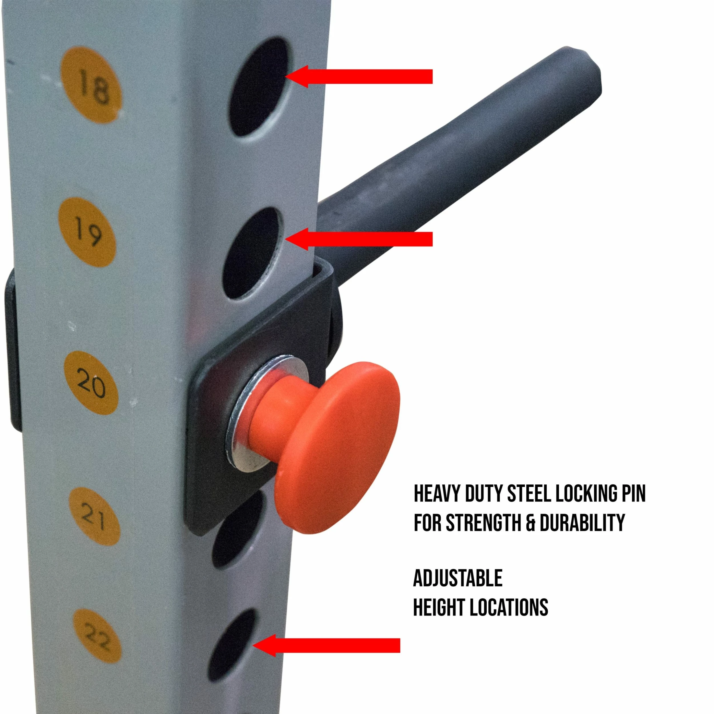 - ADJUSTABLE: Easily attaches to power rack frames by pulling the red popper pin and sliding the attachment into place. Provides the ability to change the height of plate storage at any time.