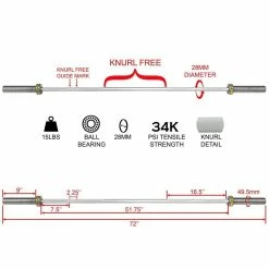 - ADDITIONAL: This training barbell should not be used for max effort lifts – the OB-72T Technique Barbell should only be used for training purposes for kids and new athletes at lighter weight. 28mm diameter, measuring 72″ in total length.