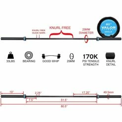 The Valor Fitness OB-80-W, Women’s Olympic Bar with Whip Action was built and designed with durability and performance in mind. Measuring 80.5” in total length, the OB-80-W weighs 15 kg (33 lb) with 2 ball bearings on each sleeve to ensure smooth, stable rotations during intense lifts while providing great whip action to enhance each lift.