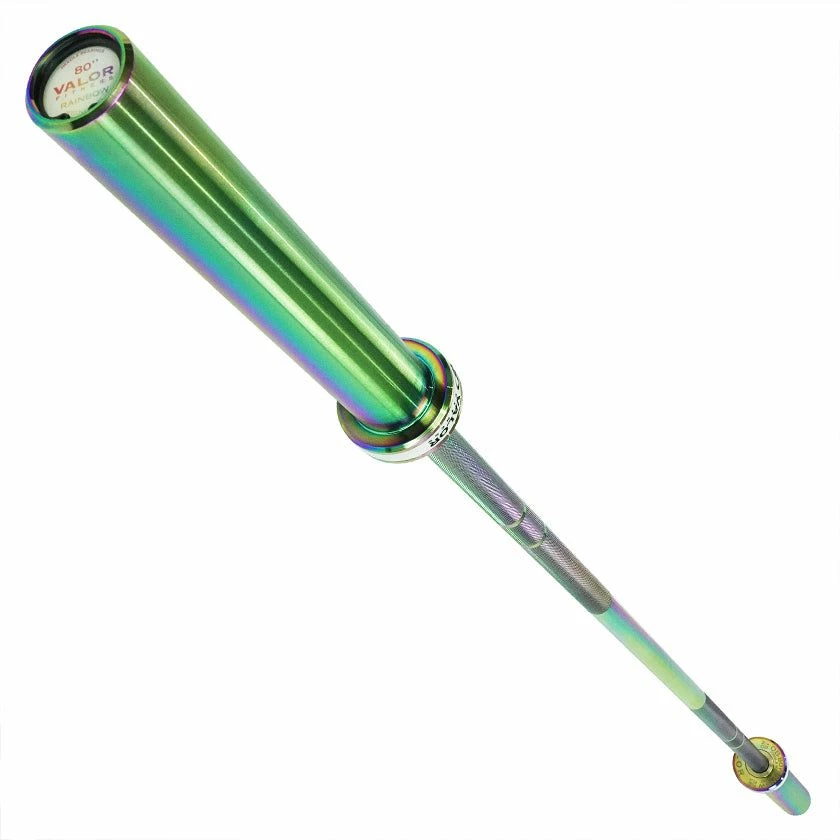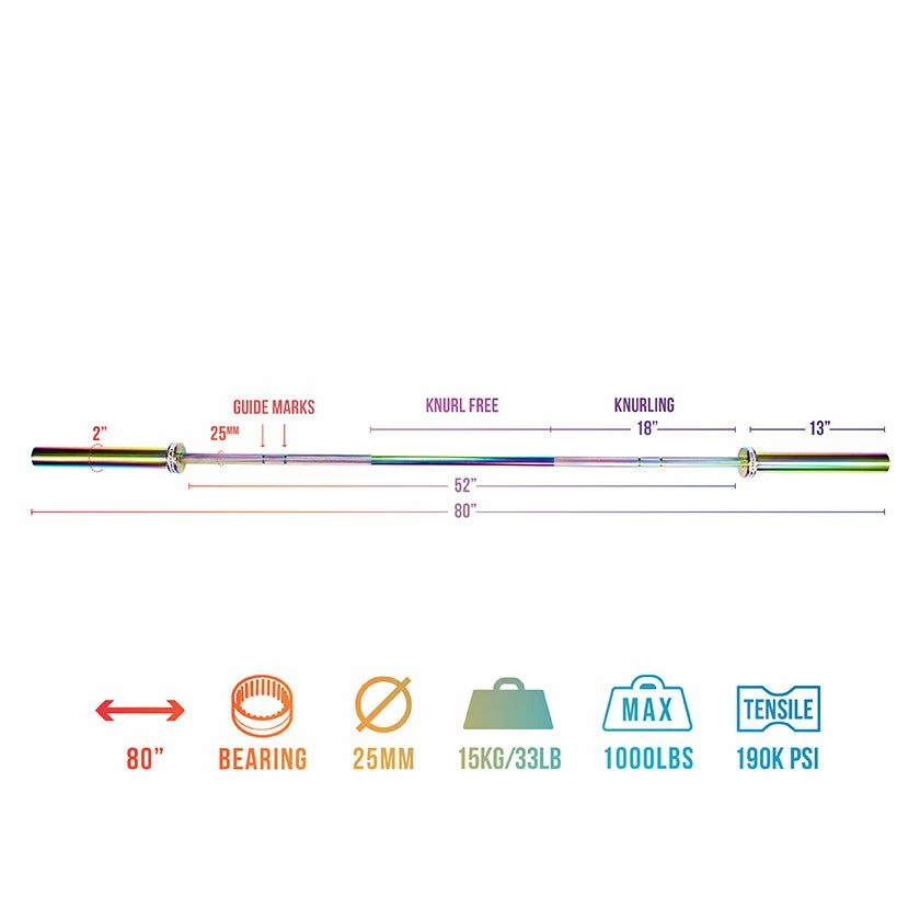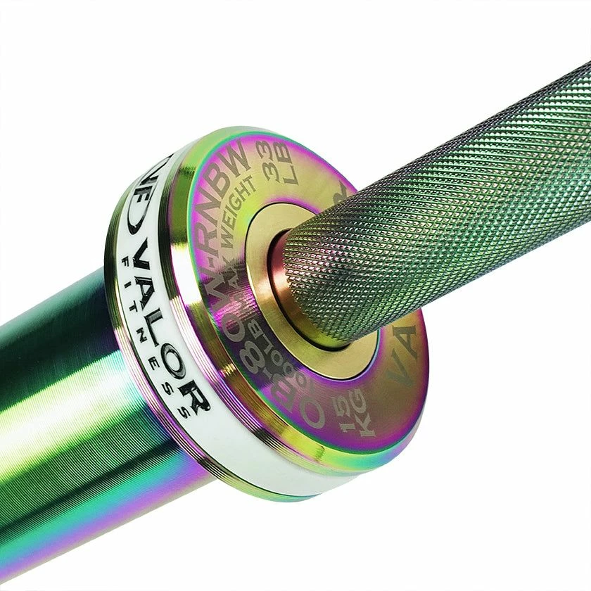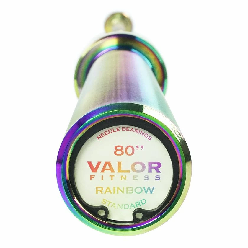 The Valor Fitness OB-80W-RNBW Women’s Rainbow Titanium Needle Bearing Olympic Bar is fully coated in a vibrant rainbow finish. Despite its unique look, it specializes in durability and performance. Measuring 80.5” in total length, the OB-80W-RNBW weighs 15 kg (33 lb) and has 2 high quality needle bearings and a bushing on each sleeve to ensure enhanced spin and rotation for improved performance and efficiency during Olympic weightlifting movements and other intense lifts while providing great whip action to enhance each lift.