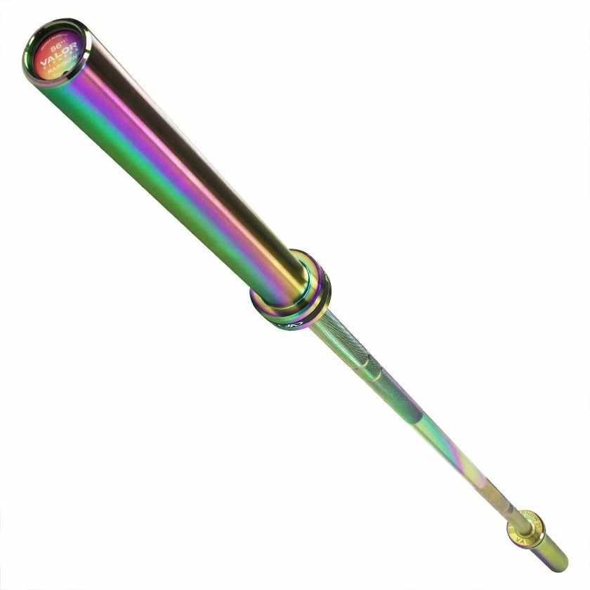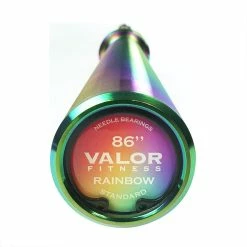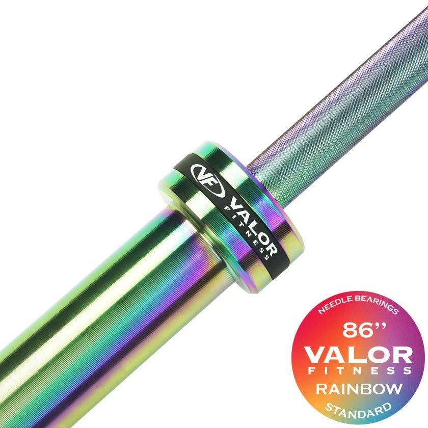 Introducing the first official Valor Fitness color finished barbell. The Valor Fitness OB-86-RNBW Men’s Rainbow Titanium Needle Bearing Olympic Bar is fully coated in a vibrant multi-color finish. Despite its unique look, it specializes in durability and performance. Measuring 86.5” in total length, the OB-86-RNBW weighs 20 kg (44 lb) and has 2 high quality needle bearings and a bushing on each sleeve to ensure enhanced spin and rotation for improved performance and efficiency during Olympic weightlifting movements and other intense lifts while providing great whip action to enhance each lift.