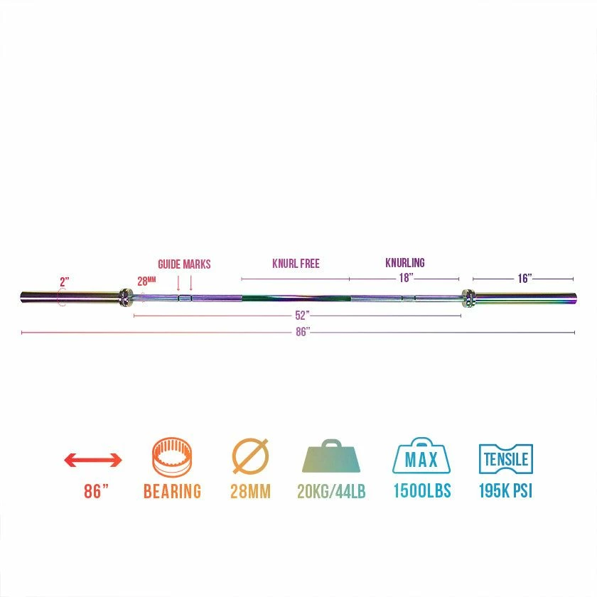 - OLYMPIC SLEEVE: The OB-86-RNBW features 16.25” of loadable sleeve length featuring fine grooves so your bumper plates won’t slide during your workout! Sleeves have a 2″ diameter to fit Olympic bumper weight plates.
