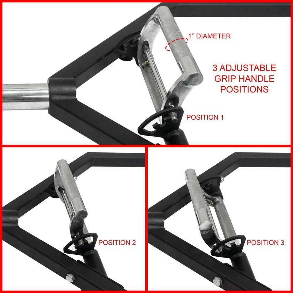 The unique, 1β handle with knurling can be adjusted between 3 different angles, allowing the user to choose which grip width and angle works best for them. To adjust the position of the handle, simply squeeze the pin with springs and move it to any of the 3 slot positions. The knurling on the handle ensures users have a strong, firm grip on the bar without excessively tearing into the hands.