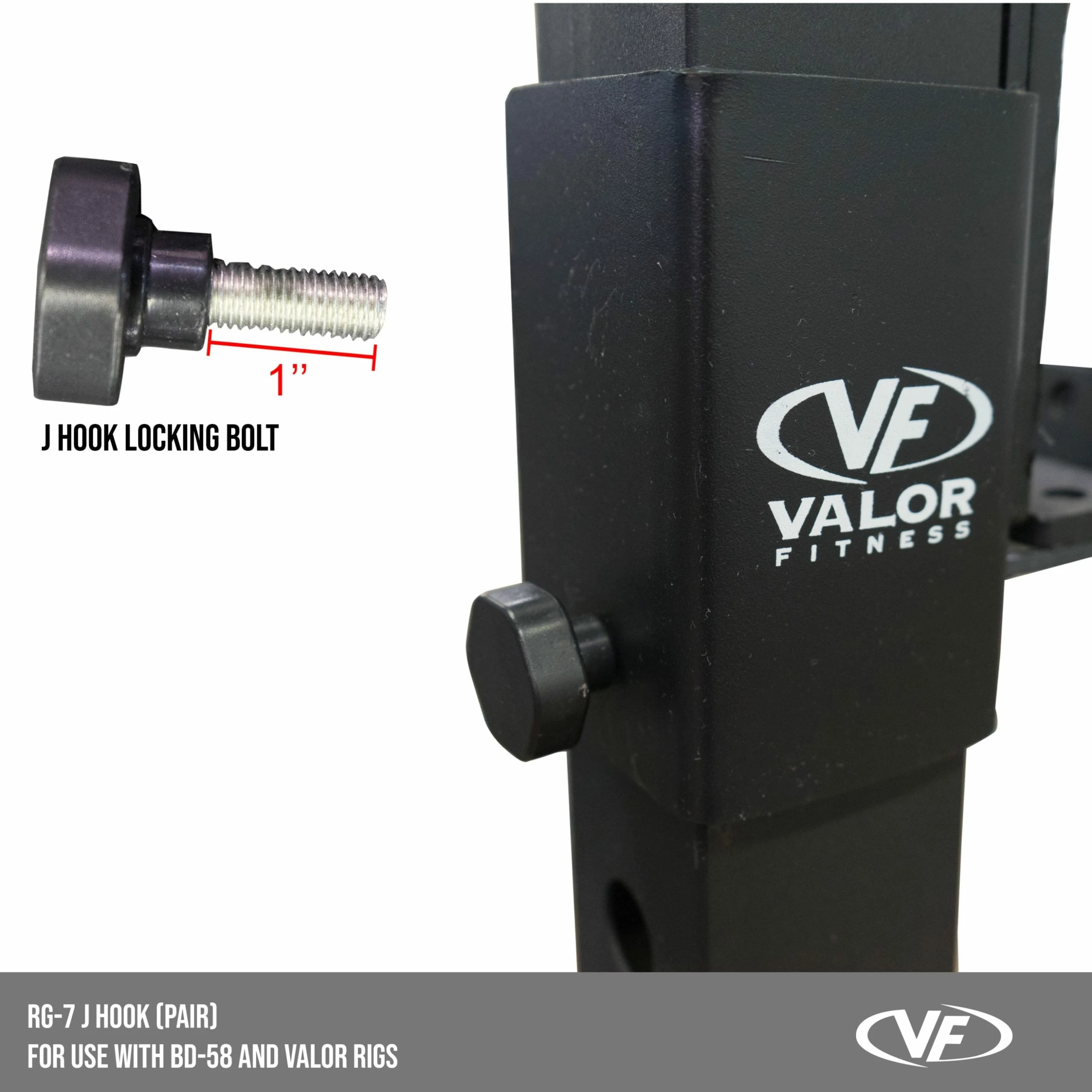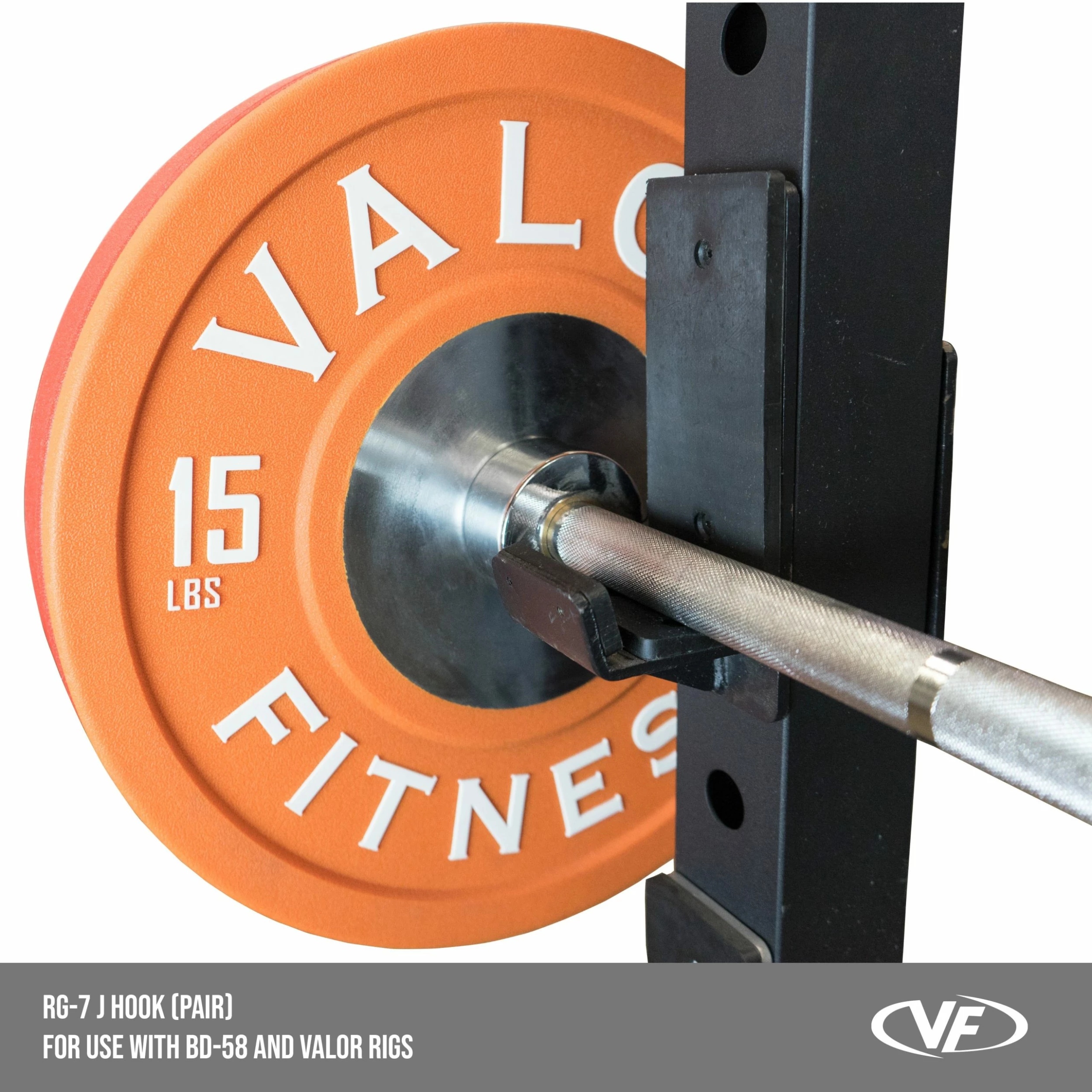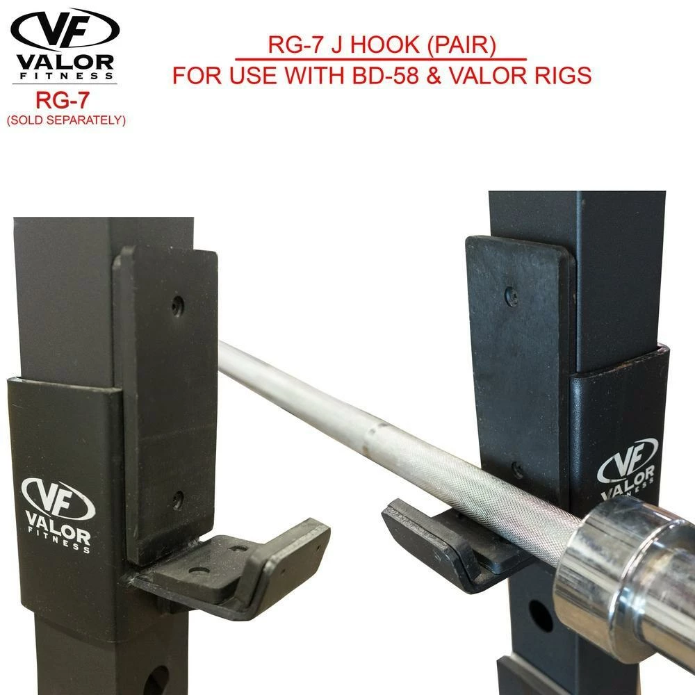 The RG-7, J Hooks by Valor Fitness are the ideal barbell holder for your power rack. Our J-Hooks are constructed of heavy duty steel to safely and effectively rack your Olympic bars. Rugged plastic padding provides shock absorption and prevents damage to your bars.Â