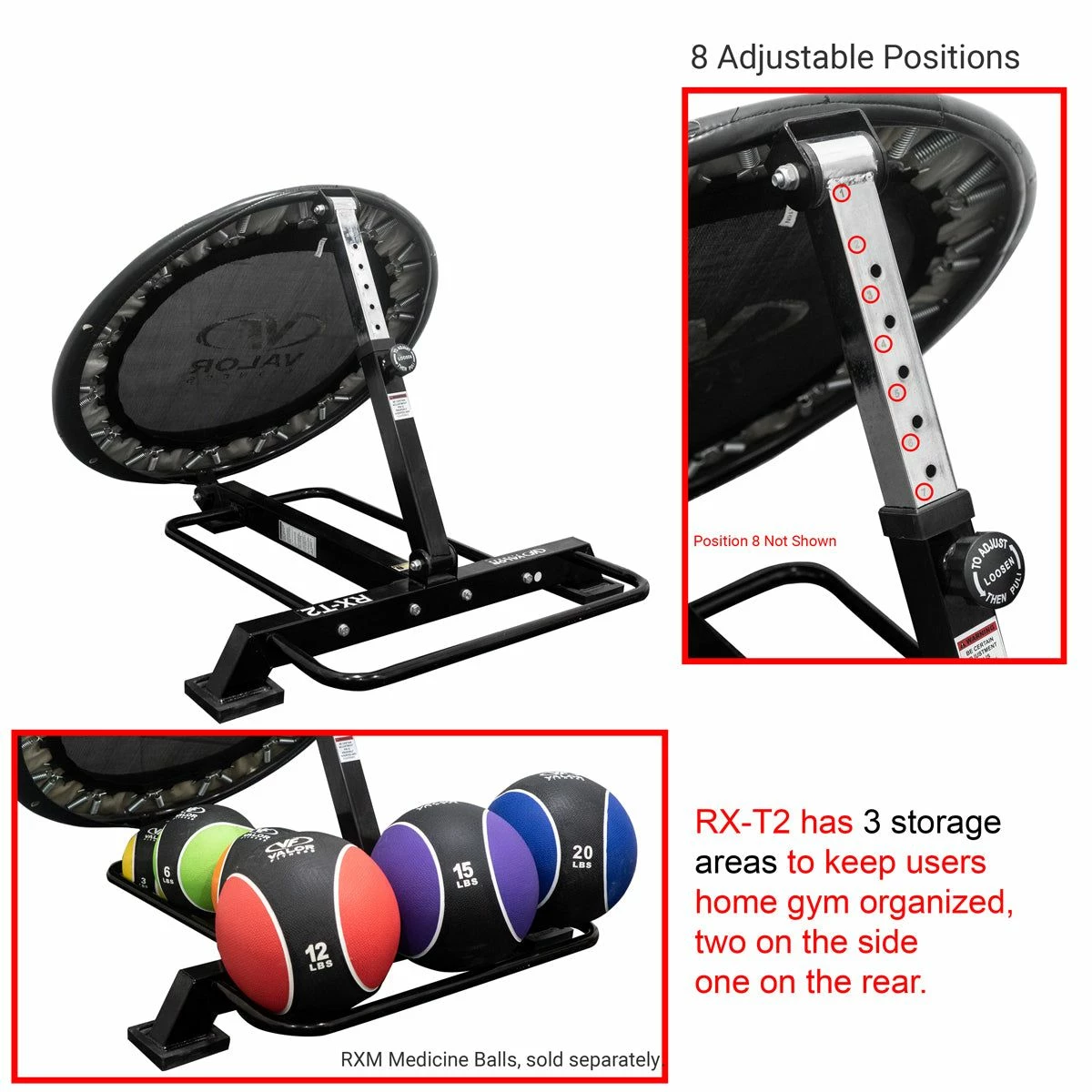 - MEDICINE BALL STORAGE– 3 ball holder slots at the rear and sides of the trampoline to organize your medicine ball set in your facility, keeping your fitness area safe and clear of clutter.
