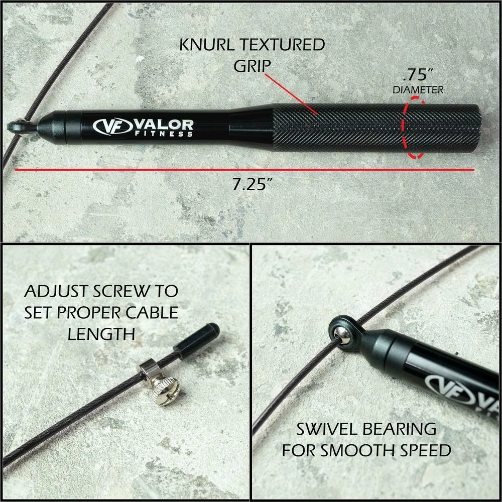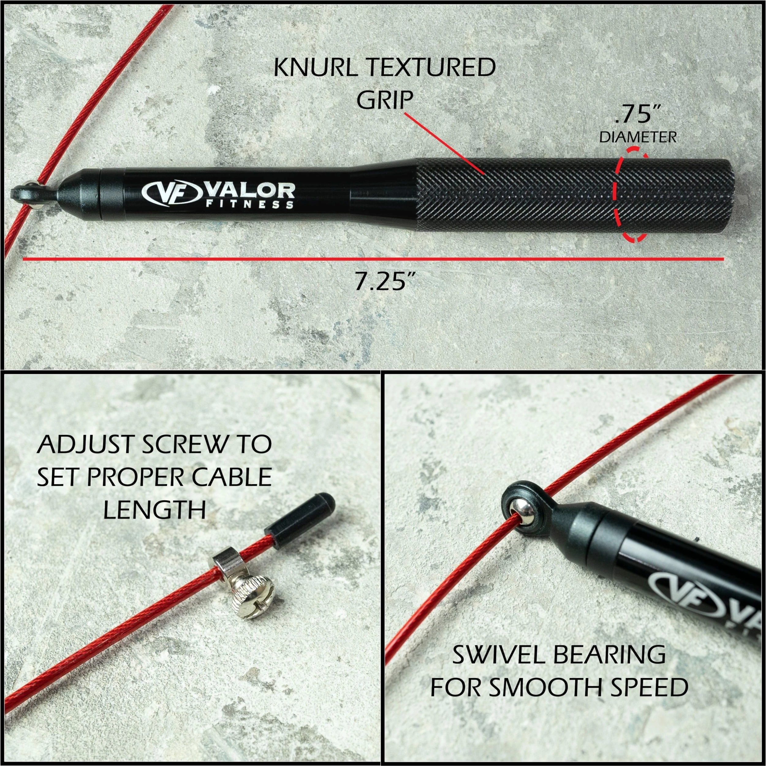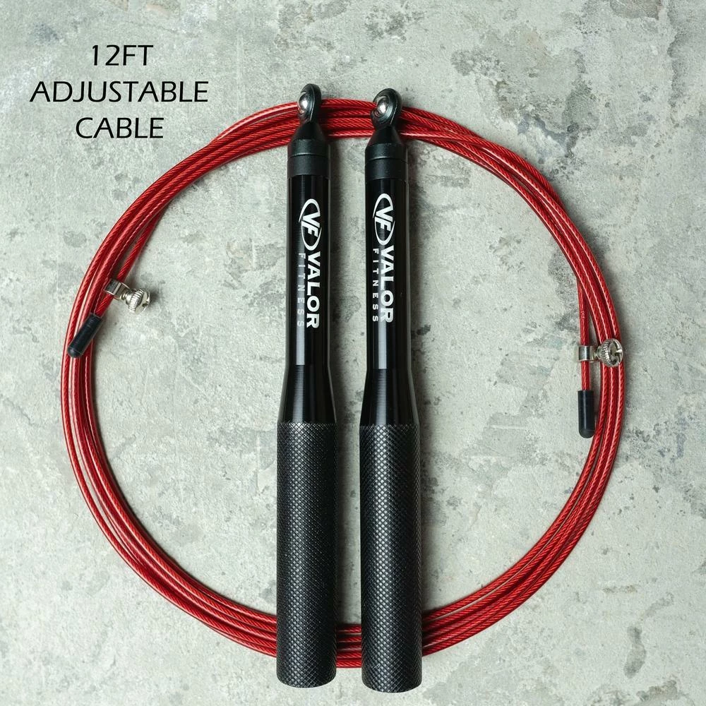 Whether you need a tool for your next WOD, training for boxing, or you just need to get your heart rate up with some rope skipping, you need a speed rope made just for you! The Valor Fitness Adjustable Speed Ropes feature a 12ft cable that can seamlessly be adjusted to fit your needs based on your height and skill level. Our speed ropes, available with a red or black rubber coated cable, are much smoother than your average jump rope.